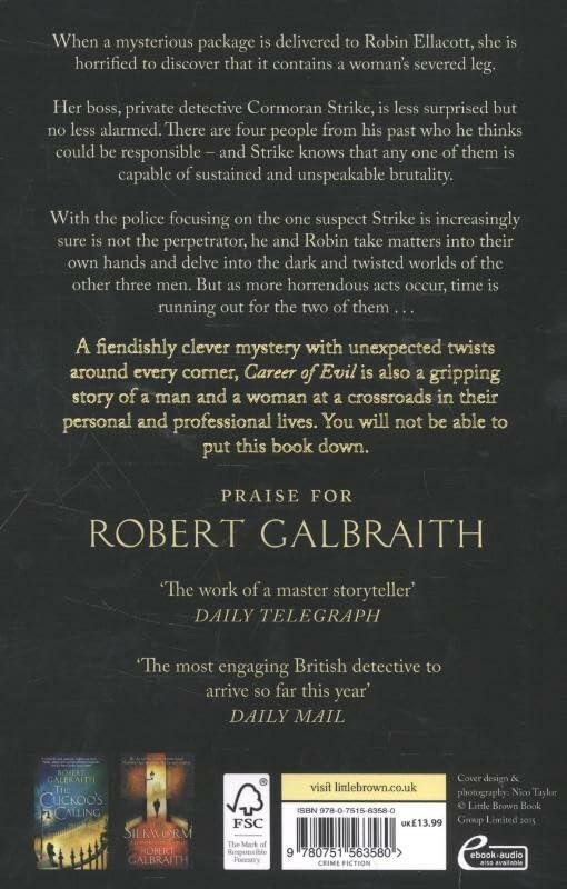 About the AuthorRobert Galbraith is a pseudonym for J.K. Rowling, successful author of the Harry Potter series and The Casual Vacancy. Career of Evil is the third book in the highly admired Cormoran Strike crime fiction series. The Cuckoo’s Calling was printed in 2013 and The Silkworm in 2014. Robert Galbraith’s Cormoran Strike stories will be changed for a major new television series for BBC One, produced by Brontë Film and Television.