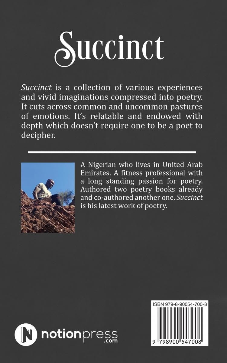 Succinct is a collection of various experiences and vivid imaginations compressed into poetry. It cuts across common and uncommon pastures of emotions. It’s relatable and endowed with depth which doesn’t require one to be a poet to decipher.