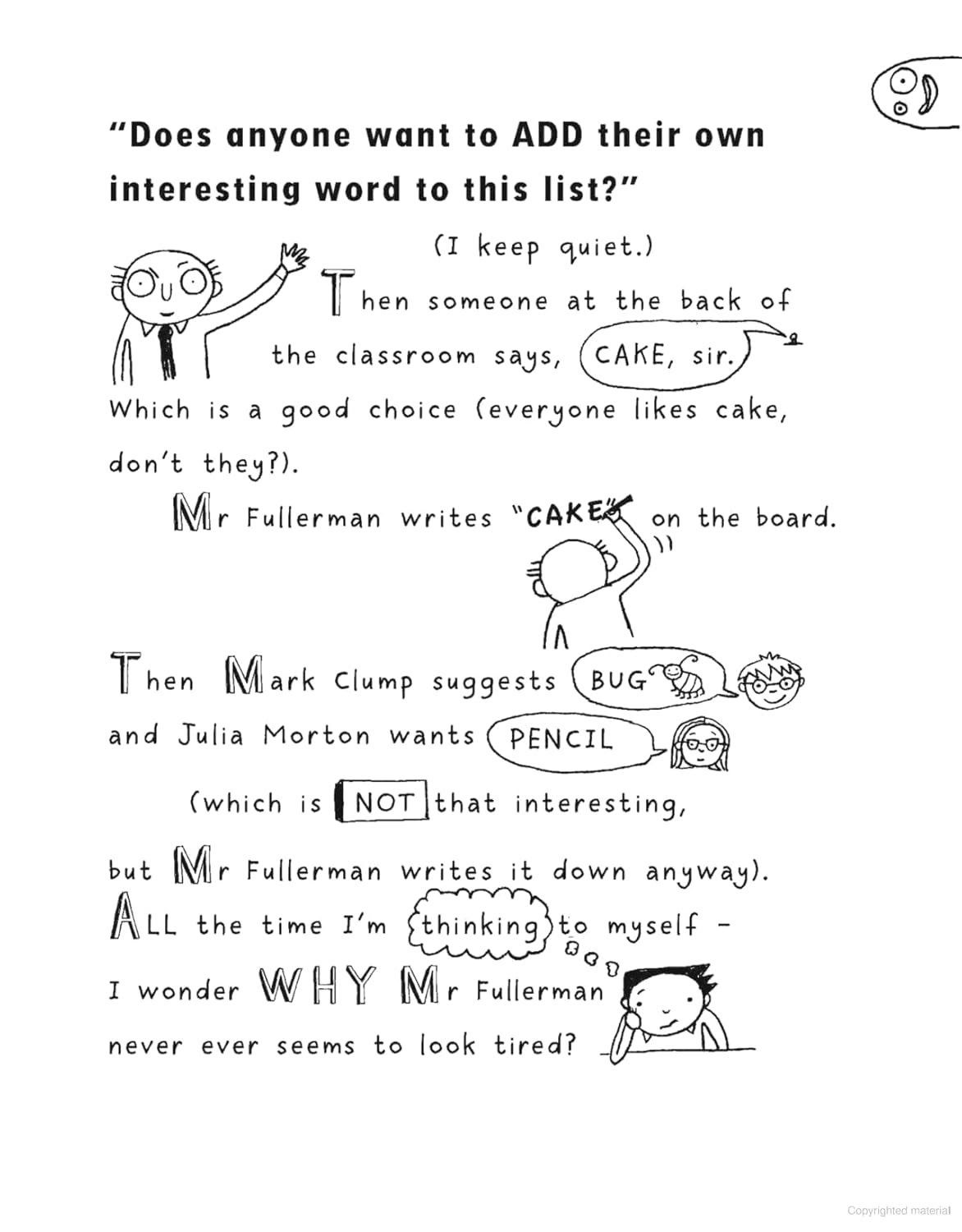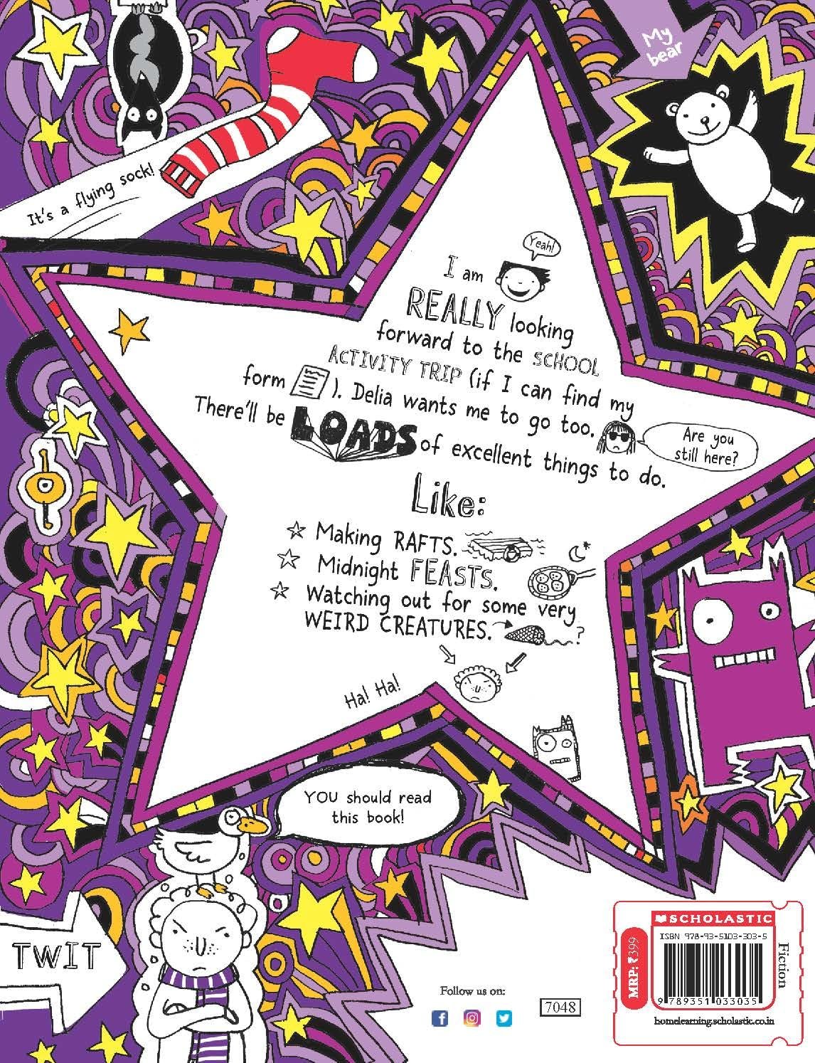This takes the form of Tom’s battered homework diary – crammed with his doodles and stories. “Exciting news! Mr Fullerman announces that Class 5f are going on an ‘activity break’! Which should be fun. As long as I don’t get stuck in a group with anyone who snores or worse still with…… Marcus meldrew. Delia is already threatening to paint My room funny colours while I’m away. Which is annoying. I just hope the only surprise I have when I get home is the new pet that I hear mum and dad talking about. Because I’ve always wanted a pet!”.